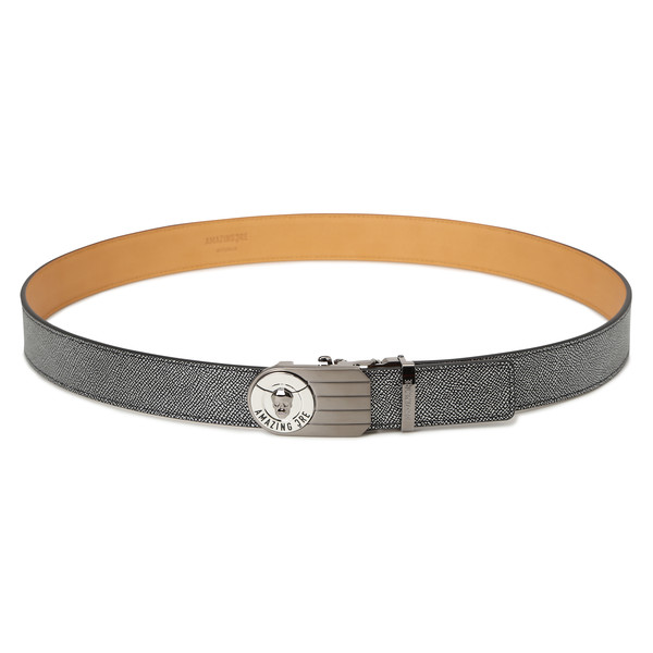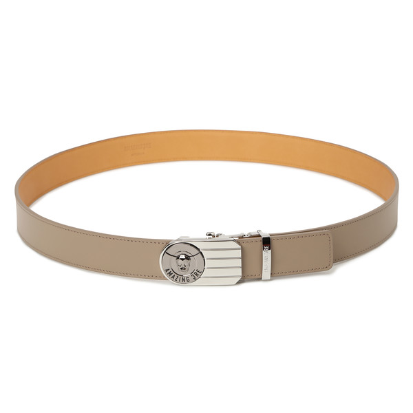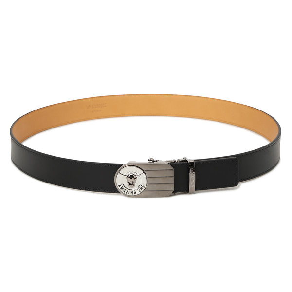 - Buckle-type belt with metal Alex logo positioned at the front